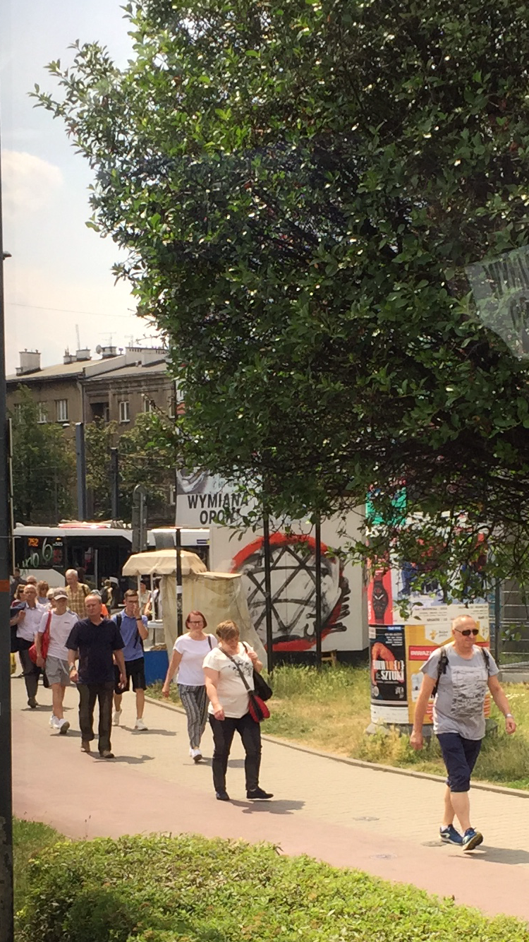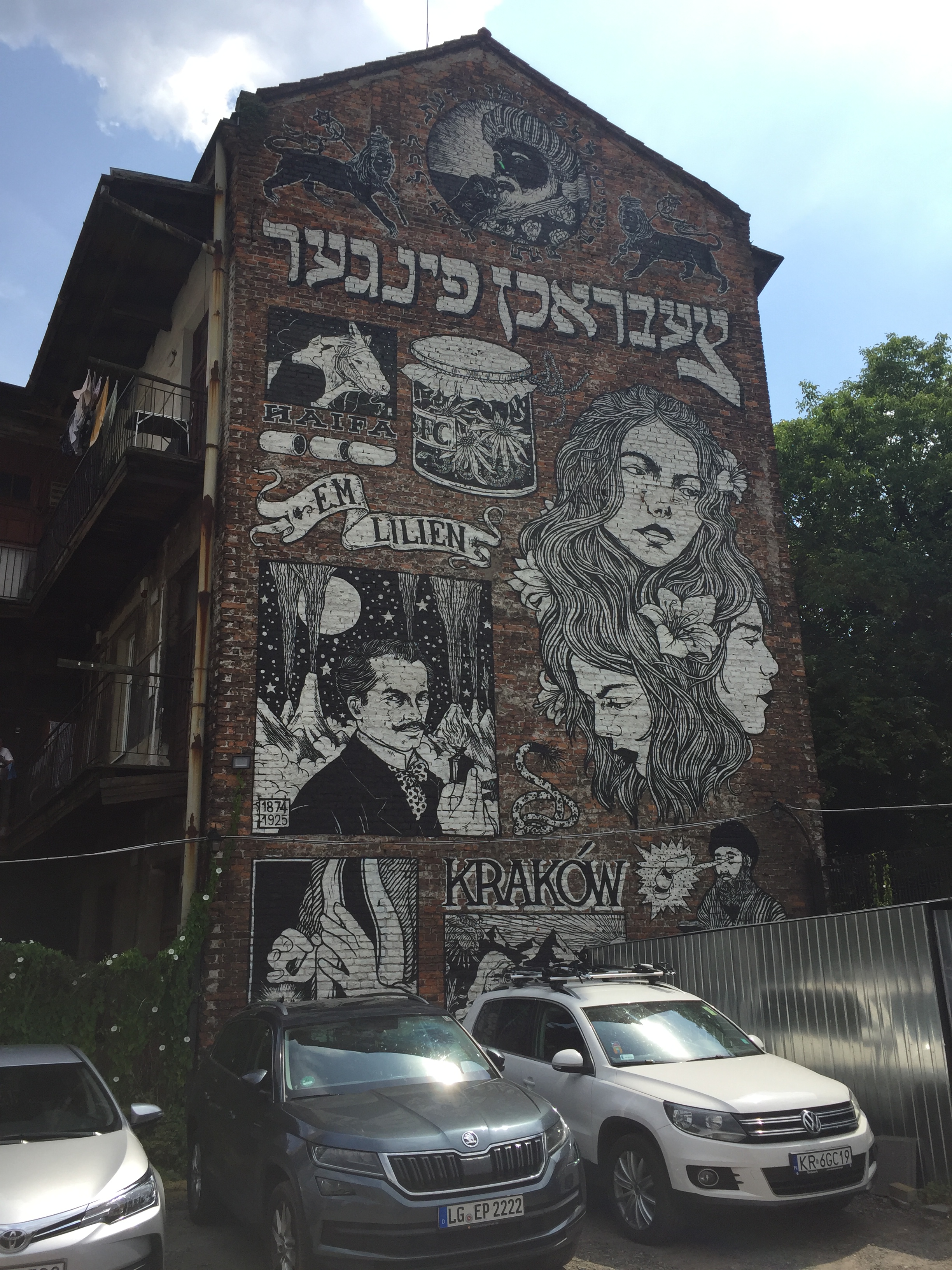 Along the way to this museum, I took some photos of graffiti. I have only been in this city for a few days, but I am pleased that I now understand what some of these symbols mean. The letters J.G. and KZM stand for Jude Gang (the “Jewish team”) of Kazimierz: a football club, whose rivals, Wisla (“Vistula”), have a white star emblem. Rivalry between supporters of these teams has at times been violent, but graffiti denigrating one or the other is the most ubiquitous expression of support.