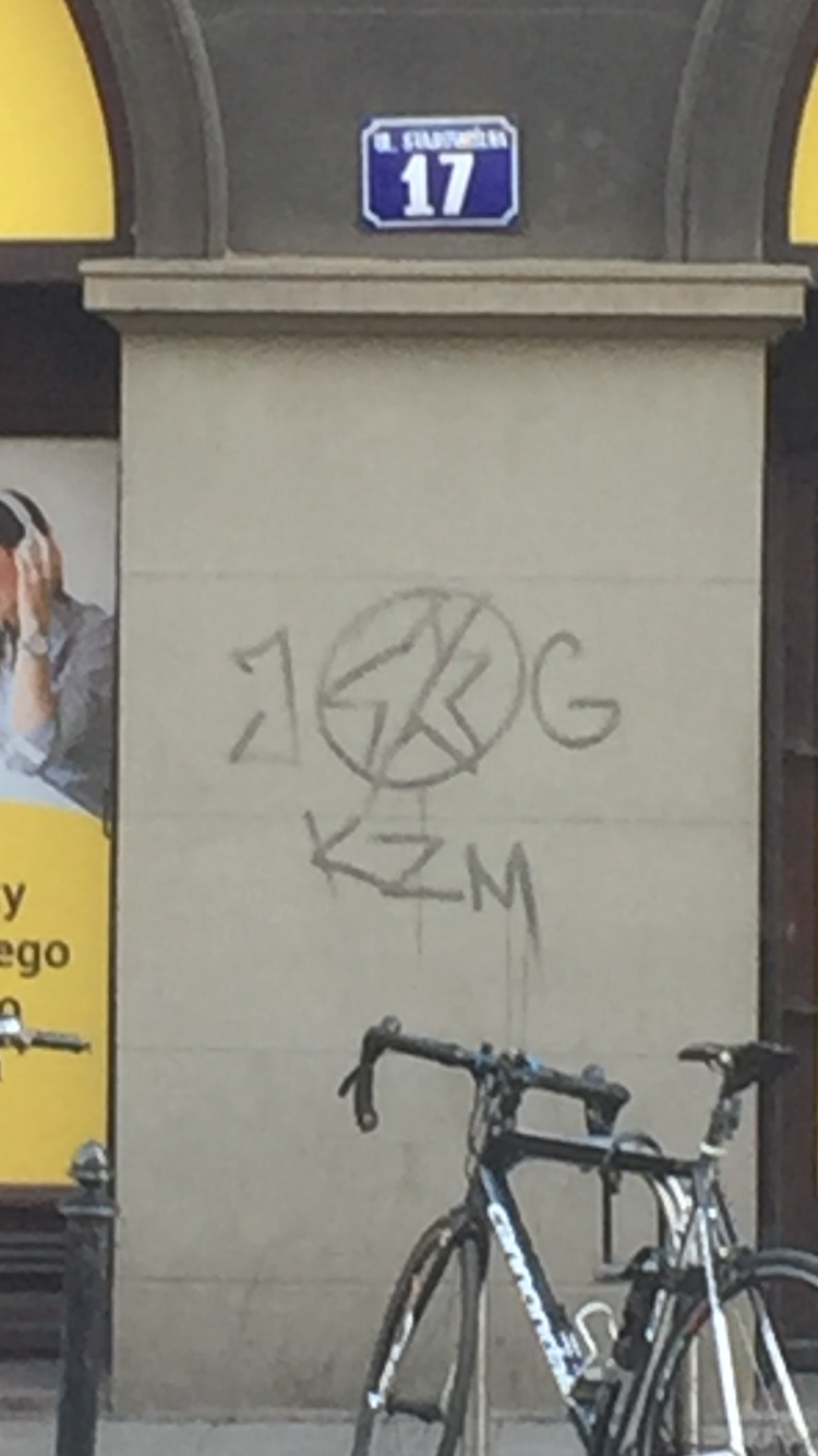 This of course helps me understand the commonly-seen response of Wisla supporters – some of which I had seen from the bus on the way into Krakow, but been unable to photograph: a six-pointed star (representative of “the Jewish team”), with a line through it.